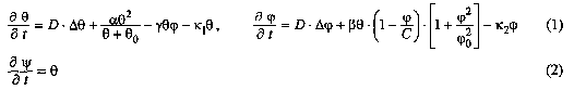Here , are concentrations of activator and inhibitor of coagulation process consequently; D is their diffusion coefficient; , , , C, 1, 2, 0, 0 are kinetic model parameters; is concentrations of forming thrombus polymer. Equations (1) have the only spatial uniform stable steady state (=0, =0). Different perturbations of activator steady distribution were used as initial conditions to simulate coagulation process in vitro.
