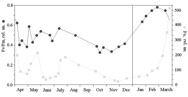 Seasonal dynamic of phytoplankton concentration (Fo) and photosynthetic activity (Fv/Fm) in pelagial area of Baikal lake in 1997. Fluorescence parameters were measured with submersible probe PrimProd.