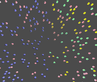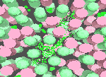 Трехмерная сцена многочастичной модели. Синим обозначены комплексы фотосистемы II, зеленым – фотосистемы I, красным – цитохром b6f, желтым – АТФ-синтаза.